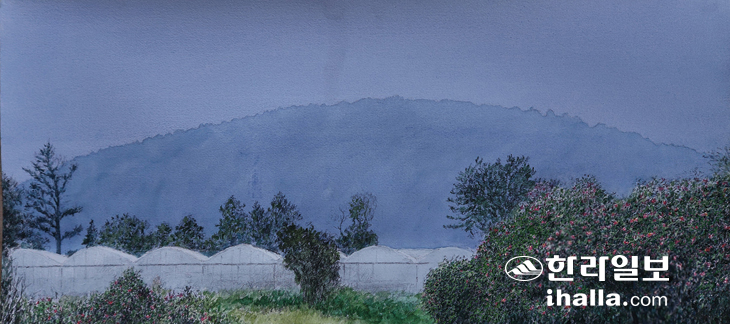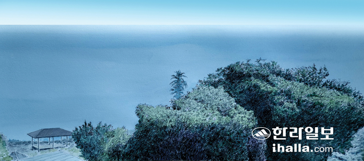 알토산이 보유한 시각적 자원은 수평선이다. 주거 공간에서 이러한 동양화 여백의 미를 느낄 수 있는 뷰포인트가 너무도 풍부하니까. 이를 입증하기 위해 그린 풍경이다. 근경에 나이 지긋한 상록수들과 바다가 산수화의 간명한 배치처럼 만난다. 어쩌면 북종화의 평면적 구성과도 흡사하다. 그 소실점의 관계를 공간적으로 증명해 주는 존재가 있으니 왼쪽 아래 길가에 있는 쉼터 정자다. 지붕이 위에서 내려다보이는 형국이니 바라보는 자의 위치가 가늠되는 상황이 되는 것이다. 흐린 날이라 바다색이 어둡다. 햇살이라도 내리쬐는 정오 시간이라면 바닷가 윤슬로 눈이 부실 것이다. 뒤로는 망오름, 앞으로는 바다가 시각적 환희를 노래하는 마을.