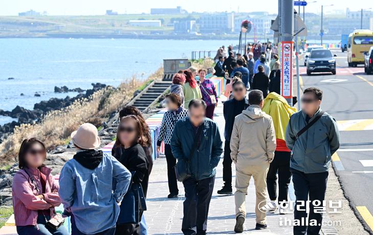 [한라일보] 2일 제주시 도두동 무지개해안을 찾은 관광객들이 제주의 봄바다를 보면서 산책하고 있다.