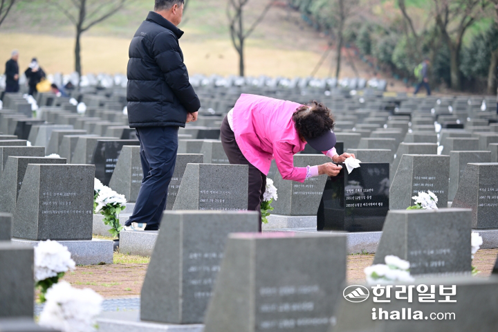 유족들, 마른 천으로 표석 닦으며 제 지내