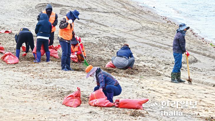 [한라일보] 6일 제주시 이호해수욕장에서 바다환경지킴이들이 파도에 밀려온 해양쓰레기를 수거하고 있다.