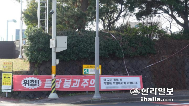 지난달 5일 제주시 모 중학교 앞 돌담에 '위험! 돌담 붕괴 주의' 현수막이 걸려 있다. 양유리기자