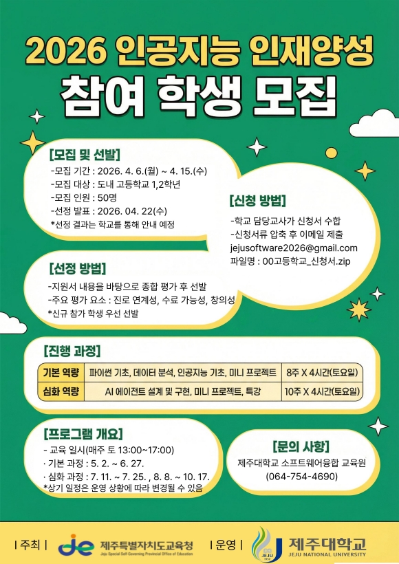 교육은 기본·심화 과정으로 나뉘어 매주 토요일 오후 1~5시 제주대학교에서 진행된다. 기본 과정은 5월 2일부터 6월 27일까지 8주간 인공지능 기술의 핵심 개념을 이해하고 정보 분석, 코딩 실습으로 문제 해결력을 기르도록 운영된다.