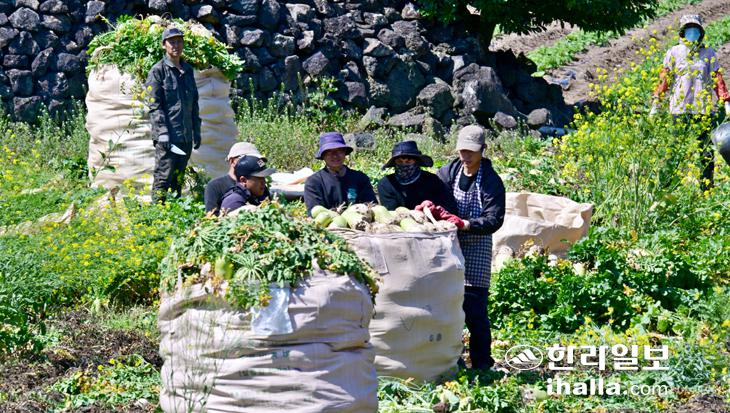 [한라일보] 7일 제주시 조천읍 한 농경지에서 농민들이 월동무 수확 작업을 하고 있다.