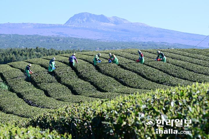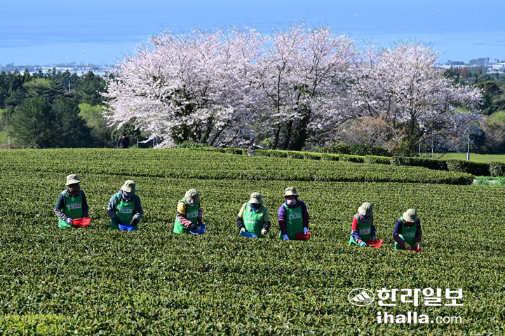 [한라일보] 서귀포시 도순동 제주 오설록 차밭에서 올해 첫 햇차 수확이 이루어지고 있다. 봄에 수확하는 첫 물차는 겨우내 성장이 멈춰있던 차나무가 다시 생육활동을 시작하면서 아니노산과 향미 성분이 가장 풍부한 걸로 알려져 있다.