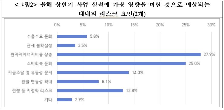 또 상반기 사업 실적에 가장 영향을 미칠 것으로 예상되는 대내외 리스크 요인(2개)으로는 응답 기업의 27.9%가 '원자재·에너지 비용 상승'을 꼽았다. 이어 ▷소비회복 둔화(25.0%) ▷자금조달과 유동성 문제(14.0%) ▷전쟁 등 지정학 리스크(12.8%) ▷환율 변동성 확대(8.1%) ▷수출 수요 둔화(5.8%) ▷관계 불확실성(3.5%) 순으로 응답했다.