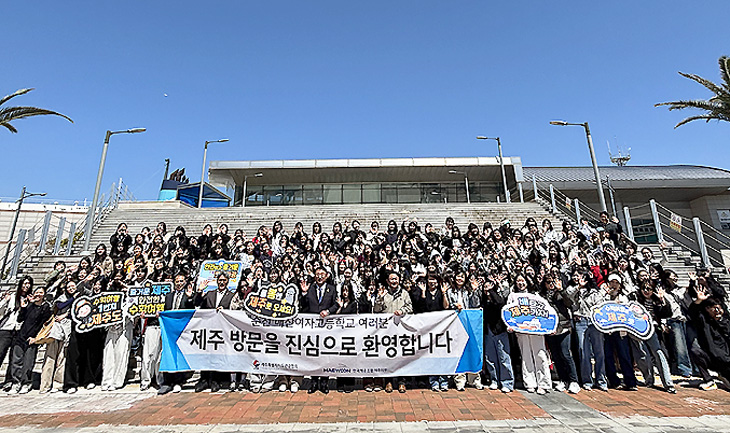 제주도관광협회(회장 강동훈)는 지난 7일 제주 연안여객터미널에서 올해 처음으로 뱃길을 이용해 제주를 찾은 대형 수학여행단인 순천매산여고 학생 200여 명을 환영하는 행사를 열었다.