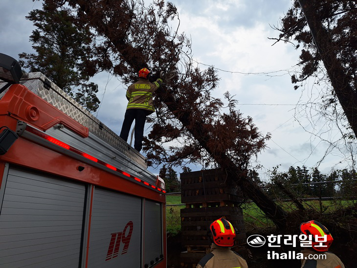 | 강풍에 쓰러진 나무에 대해 안전조치하고 있는 소방대원. 제주도소방안전본부 |