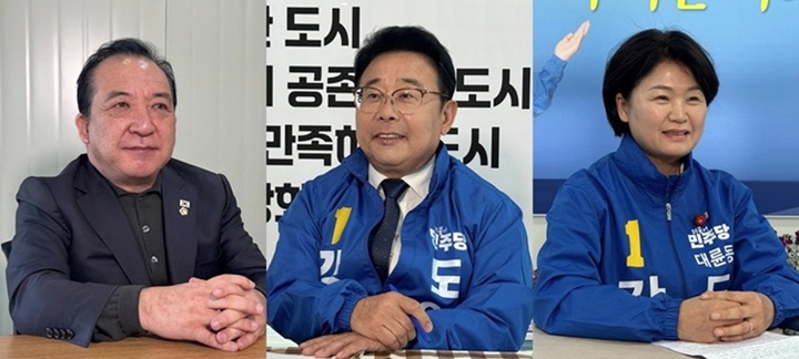 왼쪽부터 국민의힘 이정엽 의원, 더불어민주당 강명균·강소연 예비후보.