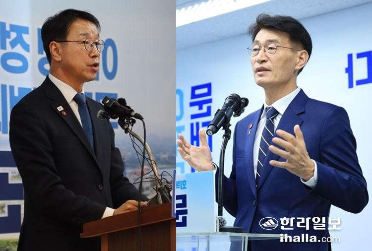 11일 각자의 경선후보사무소에서 기자회견을 연 위성곤, 문대림 후보.