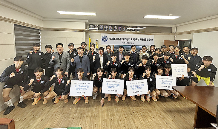 제주중앙고등학교(교장 조성배)는 지난 8일 열린 '제2회 제주중앙고 축구부 지원금 전달식'에서 장학금 700만원을 전달받았다. 장학금은 오름축구회, 돌담축구회, 백록축구회, 소낭축구회, 우리축구회(FC) 등 도내 생활체육 5개 단체가 지원했다.