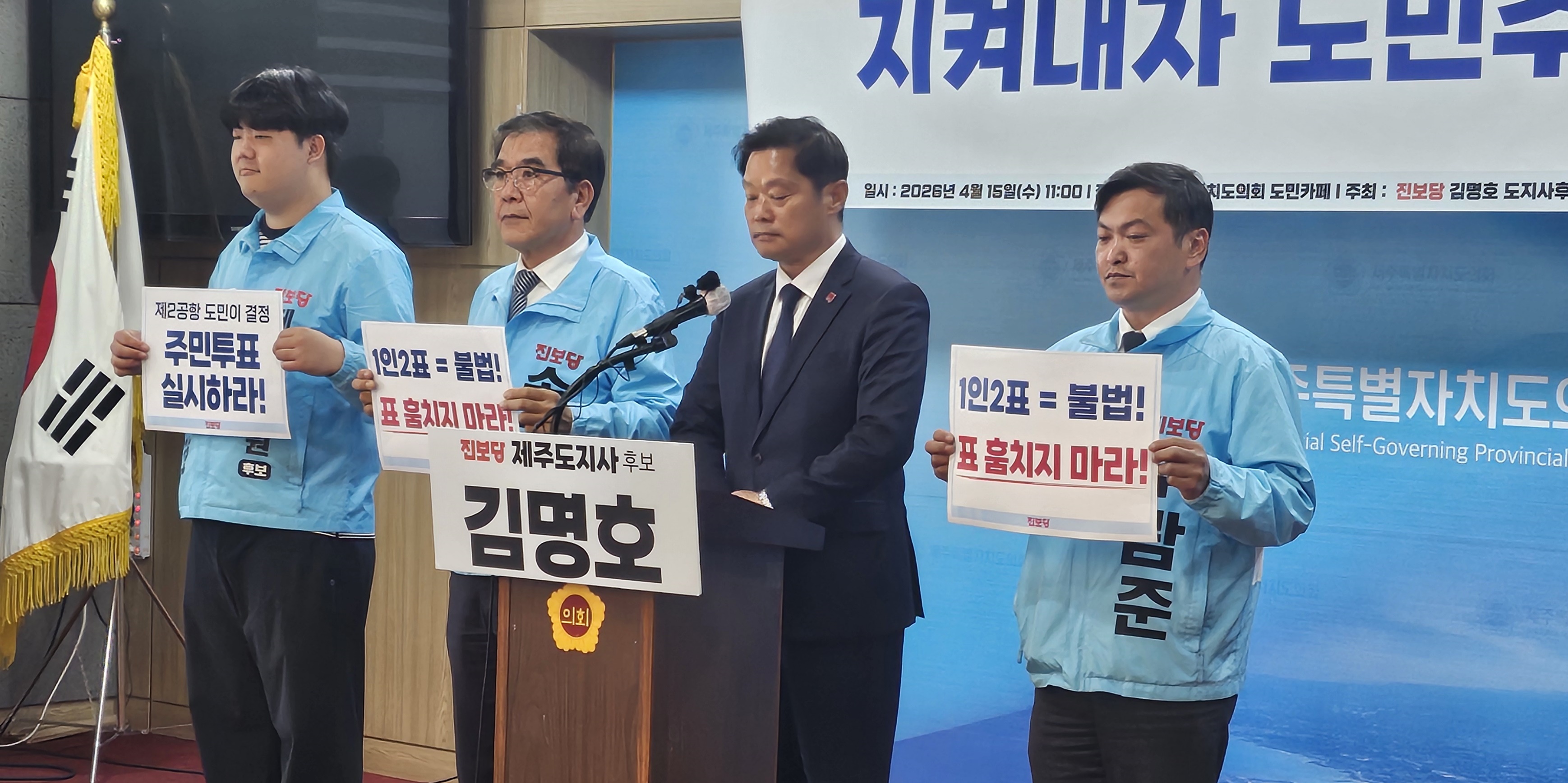진보당 도당은 15일 제주도의회 도민카페에서 기자회견을 열고 "이번 1인 2표 논란은 단순한 불법선거가 아니라 도민의 표를 가로채 결과를 바꾸려 한, 도민의 주권을 빼앗은 사건"이라며 "오늘 이 자리를 도민주권을 되찾는 정치개혁의 시작으로 선언한다"고 밝혔다.