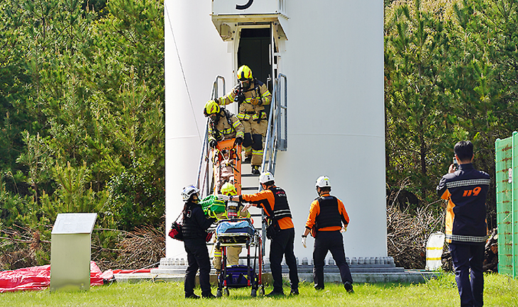 주요 훈련 내용은 ▷화재 발생 초기 자체 소방시설을 활용한 초기 진화 ▷나셀 내부 고립 작업자 구조 ▷70m 굴절 사다리차 등 특수차량을 활용한 고소 화재진압 ▷산불진화대·의용소방대 합동 산불 진압 등이다.