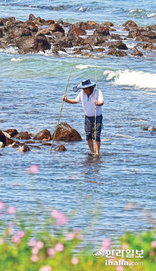 [한라일보] 15일 서귀포시 성산읍 성산리 해안가에서 한 어르신이 문어잡이를 하고 있다.