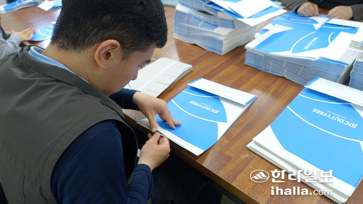 | 희망나래일터에서 근무하는 발달장애인 노동자가 제주국제자유도시개발센터(JDC) 면세점 쇼핑백을 반듯하게 접고 있다. 양유리기자 |