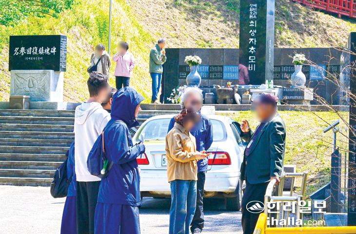[한라일보] 16일 서귀포시 대정읍 상모리 섯알오름학살터를 찾은 관광객들이 해설사의 설명을 듣고 있다.