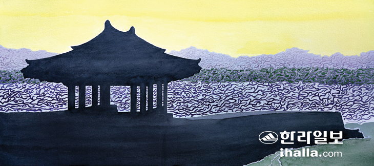 포스터처럼 풍경화를 그렸다. 반대로 생각하면 풍경화를 그리는 과정에서 명월진성 자체가 하나의 응축된 심벌로 느껴지도록 형상화해야 할 필요성을 느꼈기 때문이다. 어느 위치와 각도에서 실루엣으로 단순화시키는 것이 현무암으로 쌓은 성의 느낌을 그대로 나타낼 수 있을 것인가 수십번을 맴돌았다. 그러다가 찾은 해법이 이 모습이다. 북제주군 시절에 복원한 명월진성 남문과 서쪽으로 뻗은 성담을 현무암의 회색을 통해 일체감을 발휘하도록 하는 것. 전체적인 연출은 요즘 용어로 아날로그적 감성이다. AI시대의 현란한 포스터가 아니라 고전적 느낌을 주는 4색 이내의 단순화. 노랑, 보라, 쑥색이 회색과 만나면 어울리니 이를 조합해 풍경 이미지에 담았다. 가장 중요한 묘사는 성의 배경이다. 전통문양의 이미지들을 보라색 선으로 흘러가게 했다. 풀잎문양과 나뭇가지문양, 구름문양, 물이 흐르는 느낌을 주는 문양까지 절묘하게 결합해 명월성축제가 지닌 전통계승 마인드를 마치 코러스 합창단처럼 배경에 깔아준 것이다.