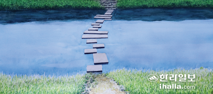 옅은 구름이 낀 봄날 오후, 물 좋기로 유명한 동명리 하천생태공원을 걷다가 만난 장면이다. 풍부한 수량을 자랑하는 모습이 정겹기도 하거니와 거울이 돼 하늘을 내려받은 신비로움이 맑은 햇살에 눈부셔서 그렸다. 하늘이 물에 내려오니 징검다리는 하늘을 날아가고 있다. 저 징검다리를 건너면 옹포리다. 그린 곳은 동명리지만 저 물은 옹포리와의 경계이자 공유지다. 현무암을 툭툭 던져 놓은 것처럼 자연스럽게 발 보폭에 맞도록 배려한 느낌도 보이는 너무도 정겨운 원초적인 다리다. 이쪽은 연두색, 물 건넌 곳은 짙은 초록색의 대비효과가 음악적 화음을 만들어 낸다. 구체적으로 설명하지 아니하더라도 두 개의 명도 관계를 보면 태양의 위치가 어디 있는지 시각적 경험으로 파악할 수 있다.