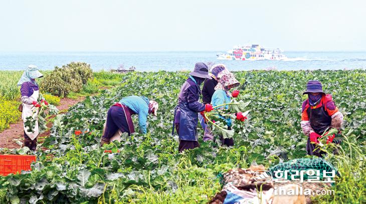 [한라일보] 지난 18일 서귀포시 대정읍 하모리 한 농경지에서 브로콜리 수확작업을 하고 있다.