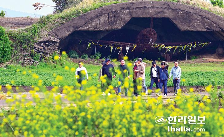 [한라일보] 지난 18일 서귀포시 대정읍 알뜨르비행장을 찾은 관광객들이 일제 강점기 흔적인 격납고를 둘러보고 있다.