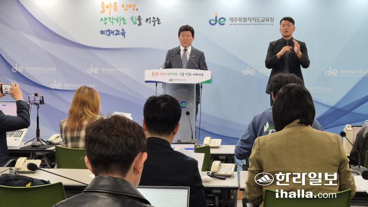 김광수 제주도교육감은 20일 도교육청 기자실에서 2026년도 제1회 추가 경정 예산안 편성에 따른 기자회견을 열고 "이번 추경을 통해 추진되는 사업들은 단순한 재정 집행에 그치지 않고 학교 현장에서 체감할 수 있는 변화로 이어질 것으로 기대하고 있다"고 밝혔다.