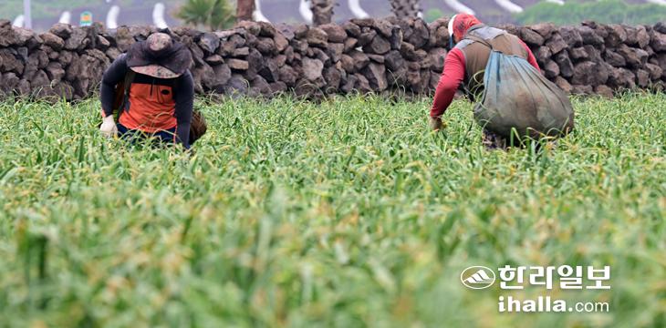 [한라일보] 잠시 비가 그친 20일 서귀포시 대정읍 신도리의 한 마늘밭에서 농민들이 마늘종 뽑기 작업을 하고 있다.
