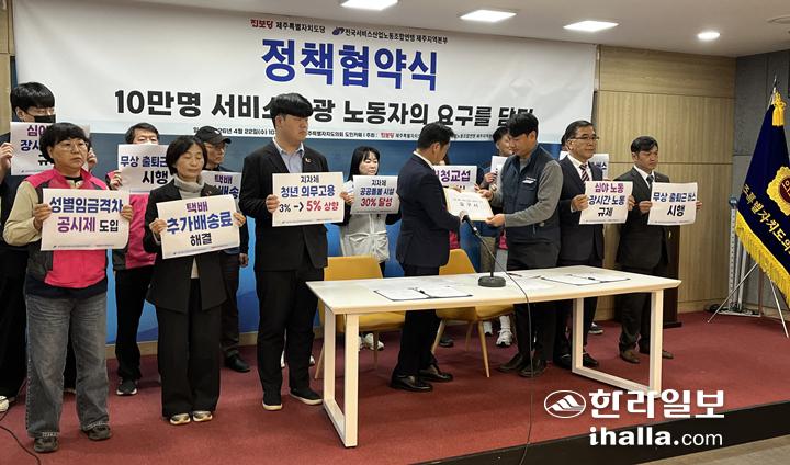 [한라일보] 진보당 김명호 제주특별자치도지사 후보와 민주노총 전국서비스산업노동조합연맹 제주지역본부가 22일 제주도의회 도민카페에서 '제9회 전국동시지방선거 공동 정책 협약'을 체결했다.