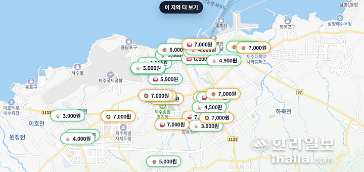 한편 한국소비자원 가격정보 종합 포털 참가격에 따르면 지난달 제주지역 칼국수 가격은 1만375원으로 전국에서 가장 비쌌다. 김밥은 지난해 3월 3375원에서 지난달 3625원으로 7.4%가량 올랐다. 같은 기간 냉면은 9250원에서 9750원으로 5.4%, 삼계탕은 15750원에서 16250원으로 7.1% 가격이 상승했다.
