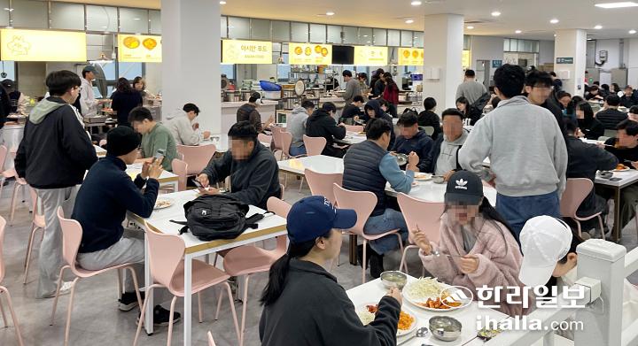 22일 낮 12시쯤 제주대학교의 한 교내식당. 거지맵에도 등재된 이곳은 ‘오늘의 정식’ 메뉴를 6000원에 판매한다. 이날 메뉴는 백미밥과 미역국, 마라불닭, 마카로니치즈콘샐러드로 매일 점심과 저녁, 다른 메뉴가 제공된다. 식당은 입구부터 식권을 구매하려는 학생들로 긴 줄이 형성됐다. 식당 내부는 이미 자리가 가득 차 시끌벅적했다.