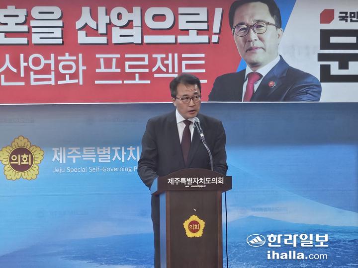문 후보는 27일 제주도의회 도민카페에서 기자회견을 열고 "해녀, 돌문화, 설화와 신화 등 제주의 문화는 세계 어디에도 없는 자산이지만 지금까지는 보존 중심 정책에 머물렀다"며 "제주의 영혼을 산업으로 키워 청년 일자리와 제주 경제의 성장동력으로 만들어야 한다"고 밝혔다.