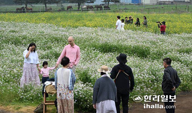 [한라일보] 28일 제주시 구좌읍 송당리 오름정원을 찾은 관광객들이 활짝 핀 갯무꽃과 유채꽃 밭에서 제주의 봄을 만끽하고 있다.