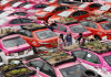 14일 태국 수도 방콕에 있는 차라푸렉 택시조합 주차장에서 직원들이 유휴 차량의 지붕 공…