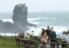 15일 서귀포시 섭지코지를 찾은 관광객들이 제14호 태풍 '찬투' 북상으로 강한 바람이 불자 …